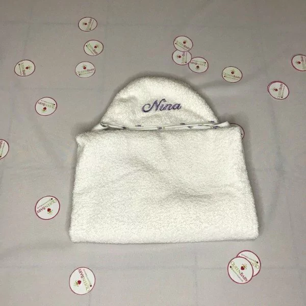 Confeccionado en toalla doble felpa 100% algodón, garantiza suavidad y absorción excepcionales. La capucha, ubicada estratégicamente en el centro, lleva bordado el nombre o las iniciales de tu bebé, dándole un toque único y personal.